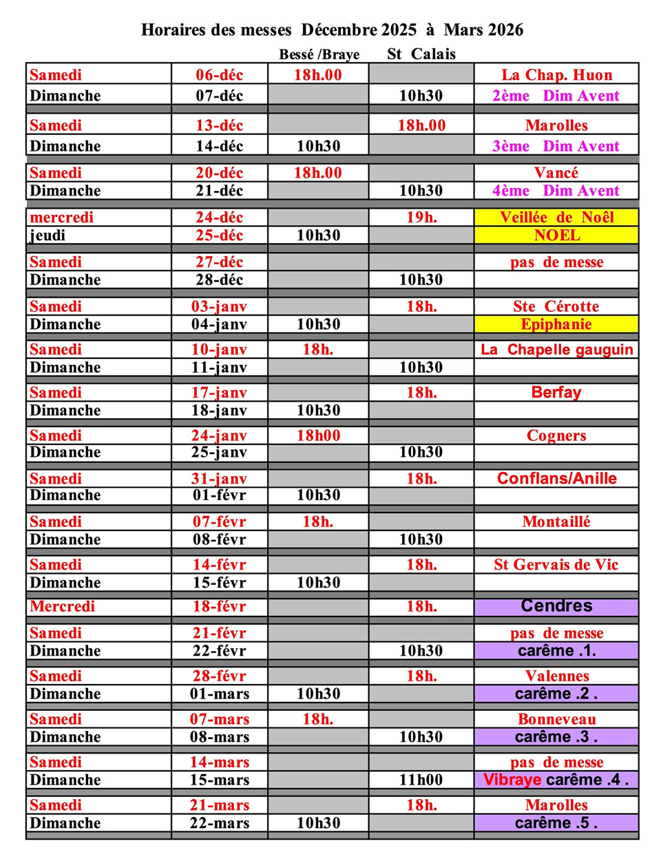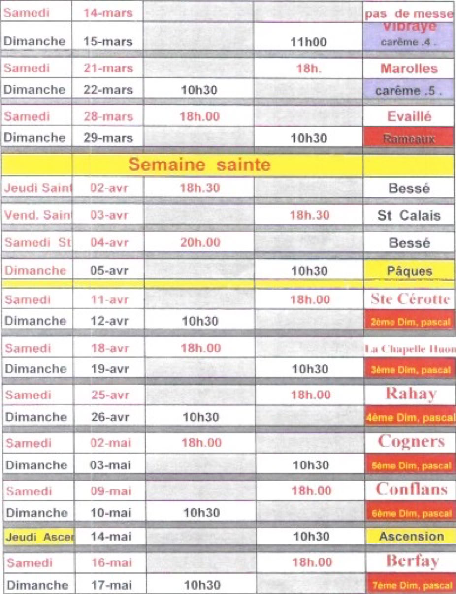 le dimanche à l’église de St Calais et de Bessé , un dimanche sur 2 . à 10h.30